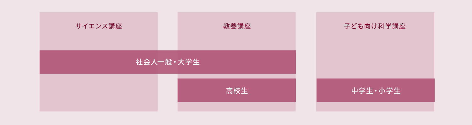 サイエンス講座、教養講座、子ども向け科学講座を多数開講しています。シニア、ビジネスパーソン、主夫・主婦などを含む社会人一般から、大学生、高校生、中学生、小学生と幅広い年代に応じた講座を用意しています。