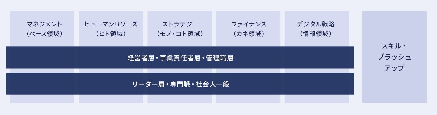いずれの領域でも、経営者層・事業責任者層、管理職層、リーダー層、専⾨職、社会⼈⼀般向けにそれぞれ講座を分類しています。また、ビジネスパーソンとしての各種スキルを⾝につけ、知識・教養を体系的に理解することができる「スキル・ブラッシュアップ」講座を設けています。